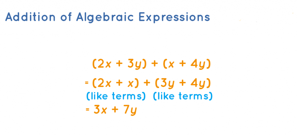 Addition of algebraic expressions is quite similar to the addition of numbers. However, the addition of algebraic expressions requires categorizing the terms in an algebraic expression into two types – like and unlike terms. Then, taking up the like terms and adding them.