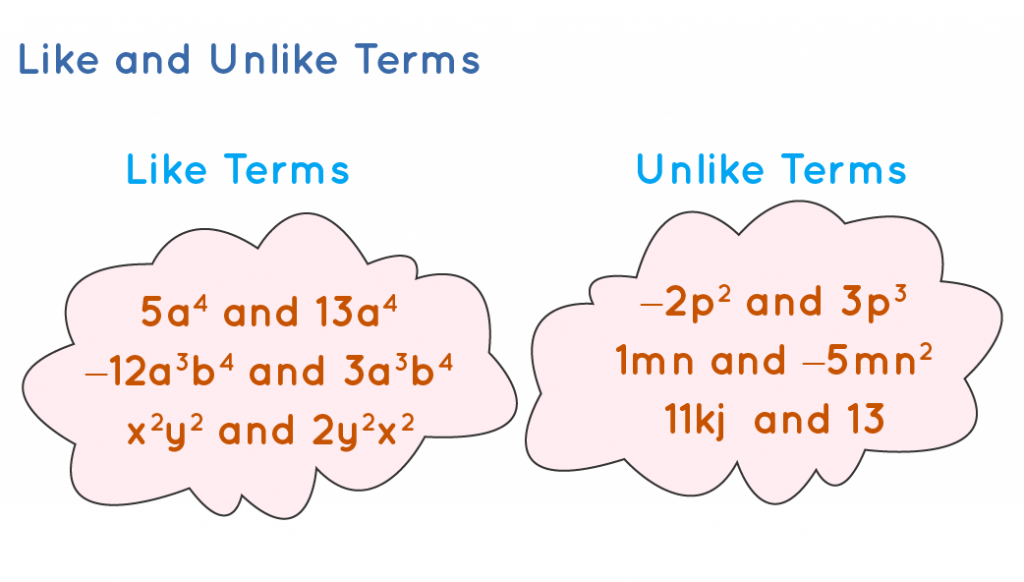 Like terms are the terms that have the same power for the same variables. In like terms, one can only change the numerical coefficient. In the below examples, only the numerical coefficient differs and we have the same variable in each of the like terms raised to the same power:
