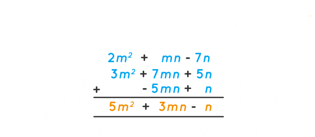 - Step 2- (2m2+3m2)+(mn+7mn-5mn)+(-7n+5n+n)