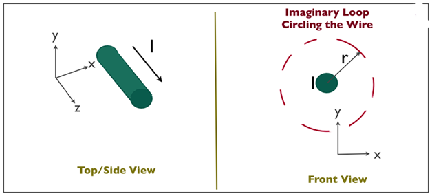In the figure below ( Figure 1), a long wire exists that carries current in Amps. We need to find out how much is the magnetic field at a distance r. Therefore, we sketch an imaginary route around the wire indicated by dotted blue toward the right in the figure.