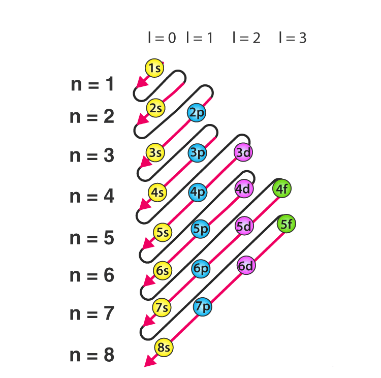 The word ‘Aufbau’ has German roots and can be roughly translated as ‘construct’ or ‘build up’. A diagram illustrating the order in which atomic orbitals are filled is provided below. Here, ‘n’ refers to the principal quantum number and ‘l’ is the azimuthal quantum number.