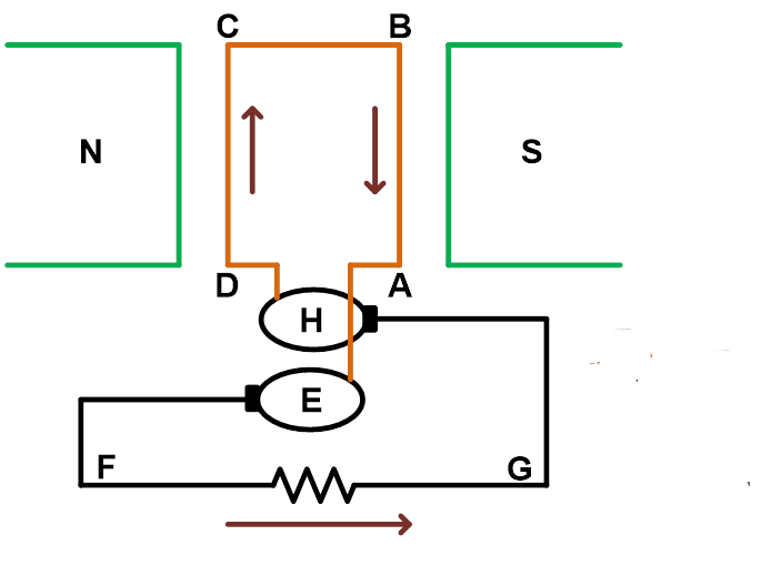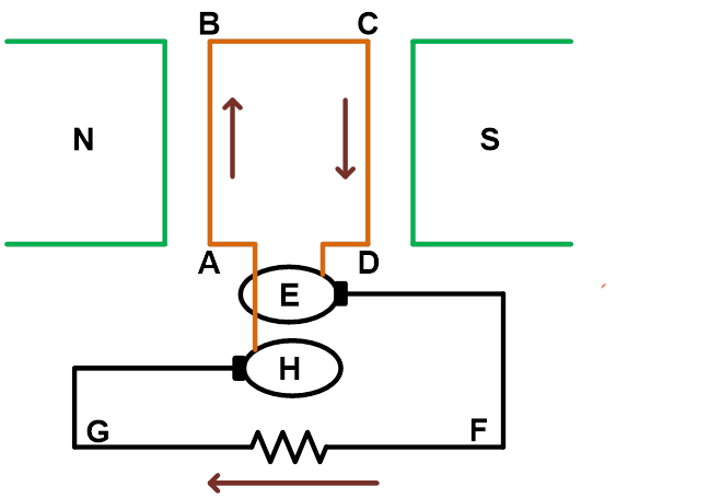 In this condition, the current passing through the conductor-1 is from B to A. And the direction of current through conductor-2 is from D to C. Therefore, the current direction through the load is from F to G.