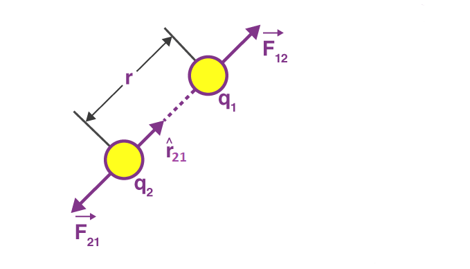 Here F12 is the force exerted by q1 on q2 and F21 is the force exerted by q2 on q1.