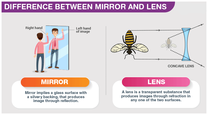 The core differences between the mirror and lens would be due to its construction and working. The mirror is the apparatus which reflects the light falling on them. Whereas, lenses are the ones that manipulate the light. The mirror is having one side reflective coating and on the other hand. Lenses are classified into various types: simple lenses and compound lenses, and depending on the type of refraction image formed by lenses: concave and convex lenses.