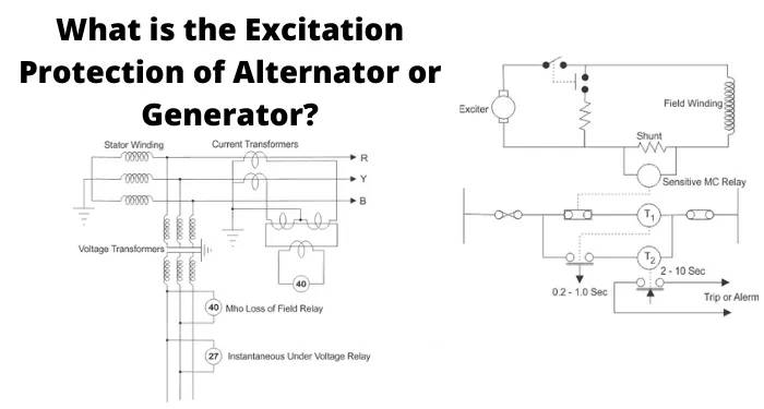 There are mainly two schemes available for protection against loss of field or excitation of a generator. In 1st scheme, we use an undercurrent relay connected in shunt with main field winding circuit. This relay will operate if the excitation current comes below its predetermined value. If the relay is to operate for complete loss of field along, it must have a setting lies well below the minimum excitation current value which can be 8% of the rated full load current. Again when loss of field occurs due to failure of exciter but not due to problem in the field circuit (field circuit remains intact) there will be an induced current at slip frequency in the field circuit. This situation makes the relay to pick up and drop off as per slip frequency of the induced current in the field. This problem can be overcome in the following manner.