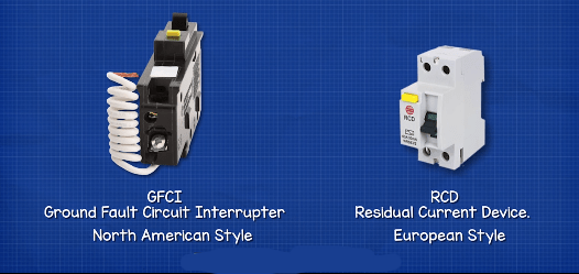 In North America, we find another device called a GFCI or a ground fault circuit interrupter. In Europe, this is called an RCD or residual current device.