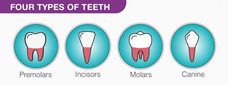 There are four types of teeth found in humans. Most other mammals have four types of teeth too.
