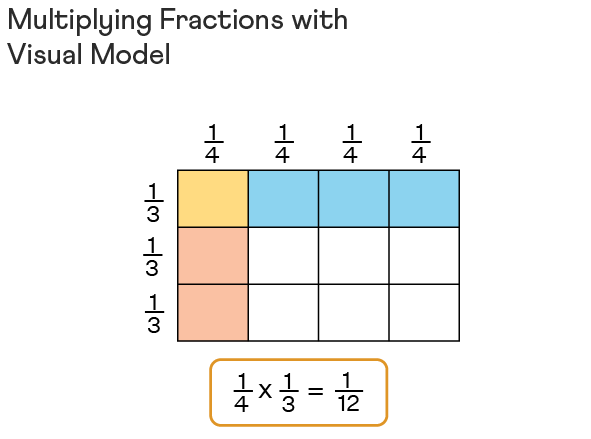 Now, let us see the visual representation for the multiplication of fractions. Visualizing the multiplication of fractions using fractional squares is a very interesting method to understand the concept. Let’s multiply these two fractions: 1/4 × 1/3 using the visual model. Draw a rectangle and divide its length into 4 equal parts. Each column will represent 1/4 of the whole rectangle. Now, divide its width into 3 equal parts such that each portion will represent 1/3. Now, we just have to look for the portion that is common to both 1/4 and 1/3, which is 1/12th of the whole rectangle (marked in light orange color in the figure below).