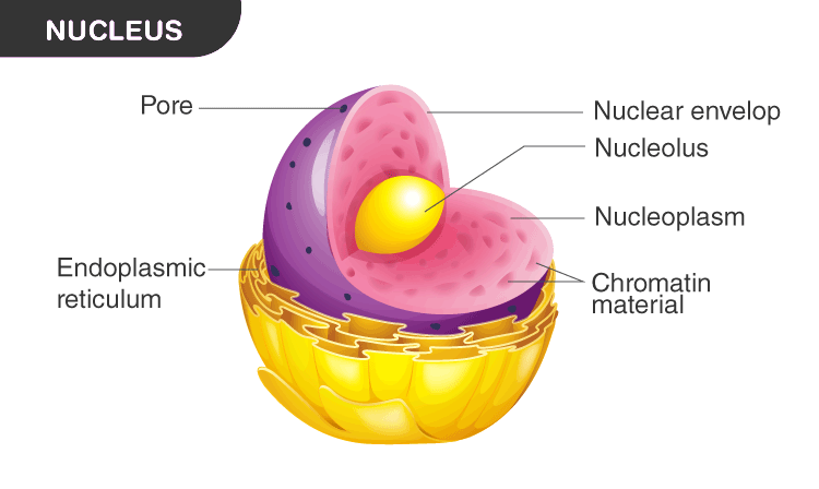 The nucleus is the processing unit of the cell. It is a double membrane-bound organelle which contains the genetic material for inheritance. The nuclear membrane contains pores that allow the transfer of materials from the nucleus to the cytoplasm. The nucleus is the brain of the cell as it controls various functions such as cell division, reproduction, inheritance, etc. The nucleus contains genetic material, i.e. chromosomes that contain DNA. DNA carry information for inheritance from parents to offspring. Prokaryotes lack a well-defined nucleus and the genetic material is present in a region known as the nucleoid.