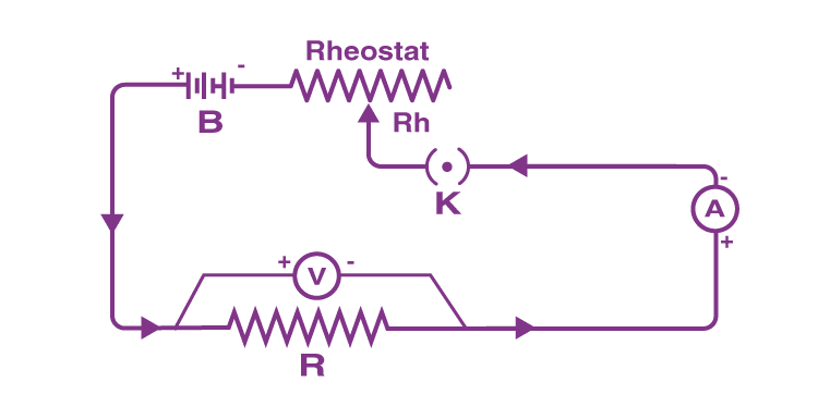 - Initially, the key K is closed and the rheostat is adjusted to get the minimum reading in Ammeter A and voltmeter.