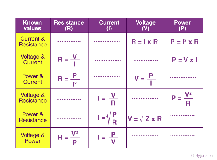 The same formula can be rewritten in order to calculate the current and resistance respectively as follows: