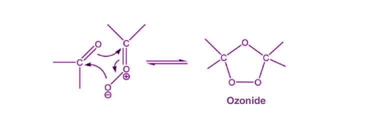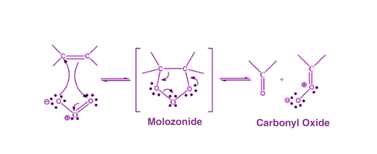 The electrophilic addition of ozone to the carbon-carbon bond forms the molozonide intermediate which is quite unstable. Due to this unstable nature, the molozonide continues reacting – breaking apart to form a carbonyl molecule and a carbonyl oxide molecule as shown below: