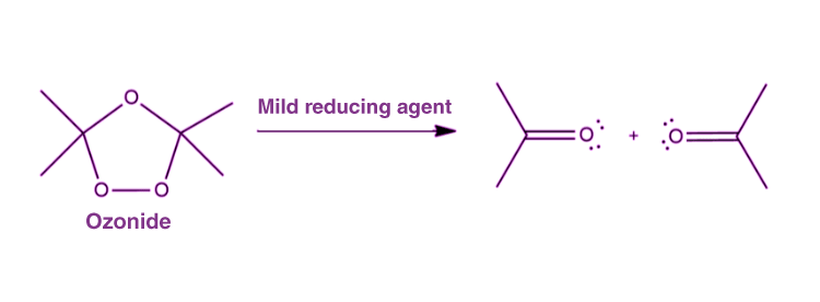 Here, the ozonide is treated with mild reducing agents such as dimethyl sulfide and zinc metal with water. The ozonide is reduced as shown below.