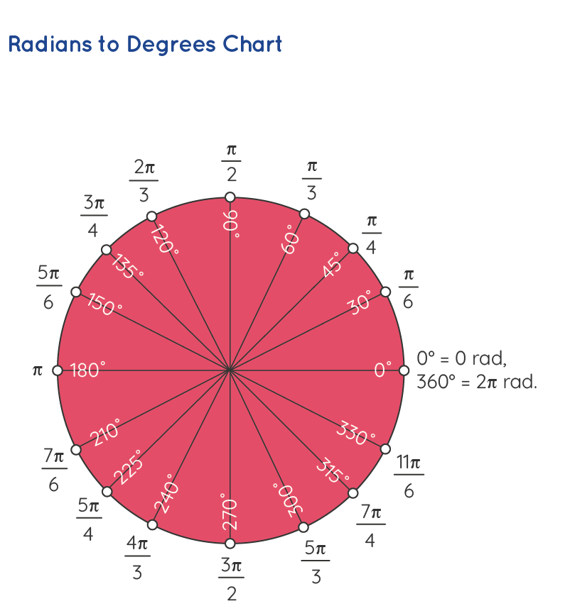 We can also refer to the following radians to degrees chart to see the measure of any angle in degrees with respect to its measure in radians. We know that for a unit circle, the circumference will be equal to 2π, which is similar to rotating 360º as shown below.