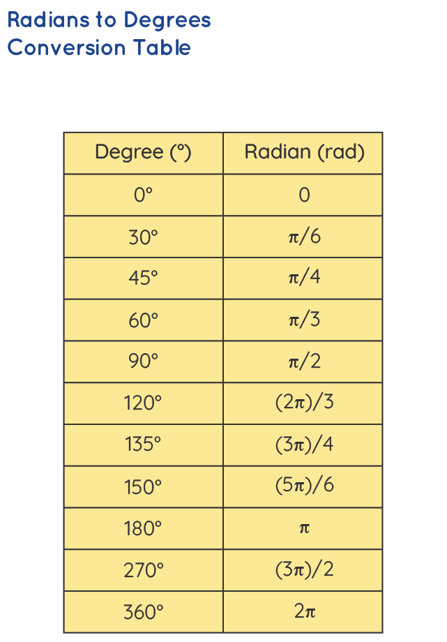 Now, let us collate the conversion of specific angles from radians to degrees which are more frequently used while solving problems. The below-given table shows the radian values for the corresponding angle measures in degrees: