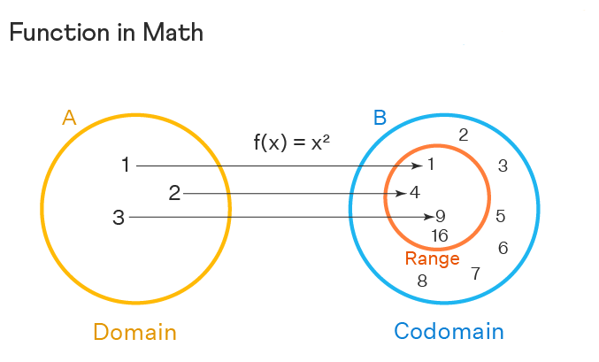 “f(x) = x2 ” is the general manner to represent a function. It is said as f of x is equal to x square. This is represented as f = {(1,1), (2,4), (3,9)}. The domain and range of a function is given as D= {1, 2, 3}, R={1,4, 9}. Here is a representation of a function in math as an ordered pair.