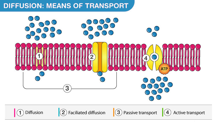 The movement of molecules from a region of their high concentration to a region of their lower concentration is known as diffusion. E.g. carbon dioxide and oxygen move across the cell membrane by diffusion.