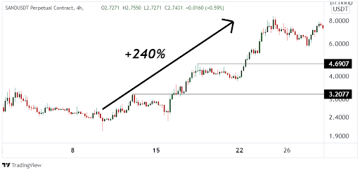 Once these hot trends are identified, a tried and tested strategy that is quite effective can be applied to the metaverse crypto or other hot trends is called “trading breakouts.” The trader will draw horizontal resistance above a recent high or the all-time high. When the market breaks above the resistance level, they buy. The benefit of this strategy is that it allows the strength of the hot trend to push the market higher.