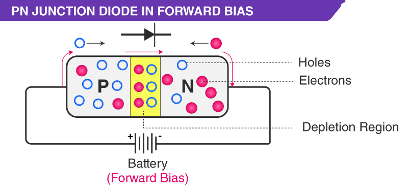 If the diode is in forward bias, the P-type region is connected with the positive terminal of the voltage source and N-type to the negative terminal. Electrons will get attracted to this terminal and will form a covalent bond with the P-type material.
