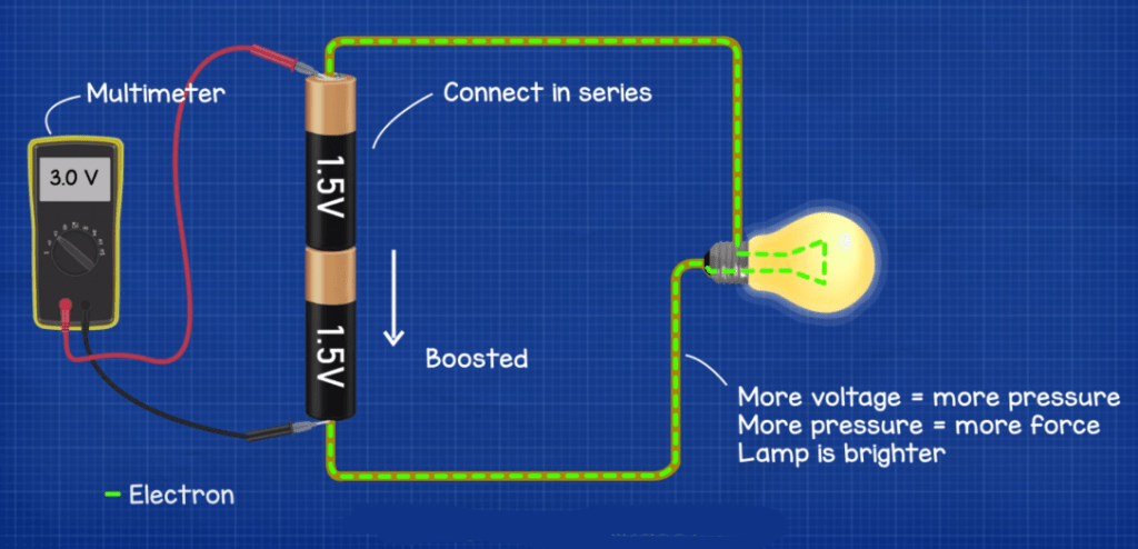 If we then added another battery to the circuit in series, then the electrons will be effectively boosted by the second battery because they can only flow along this path and there is more energy being added. This will combine the voltages and so we get 3 Volts. More volts = more pressure which means more pushing force so more electrons will flow and the lamp will glow brighter.