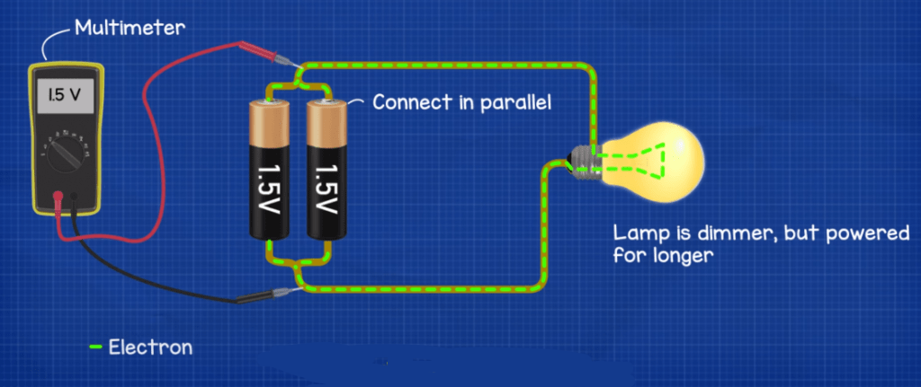 However, if we were to move the battery and connect it in parallel, then the path of the electrons splits, some will flow the first battery and some will flow to the second battery, therefore the batteries will both provide the same amount of energy so the voltage isn’t combined and isn’t boosted. We only get 1.5 Volts. The work load is split by the batteries and the lamp will be powered for longer, but it will be dimmer.