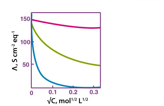 1. Kohlrausch law helps us in the determination of limiting molar conductivities for any electrolyte. Weak electrolytes have lower molar conductivities and lower degree of dissociation at higher concentrations. The graph plotted between molar conductivity and c1/2 (where c is the concentration) is not a straight line for weak electrolytes. The molar conductivity of weak electrolyte increases steeply at lower concentrations. Therefore, limiting molar conductivity, Λ cannot be obtained by extrapolation of molar conductivity to zero concentration. Hence, we use the Kohlrausch law of independent migration of ions for the determination of limiting molar conductivity, Λ for weak electrolytes.